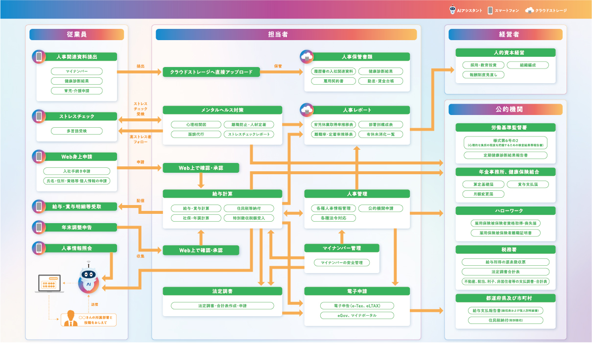 人事労務管理業務を一元化したい企業様向けクラウド人事労務サービス。AI活用で業務の自動化・共有化を実現し、年末調整・給与明細、身上申請などの業務を電子化してオールインワンで利用できます。