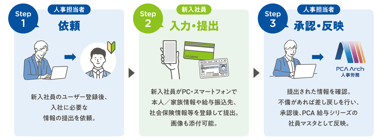 入社手続きで収集した新入社員の情報を『PCA Arch 人事労務』の社員マスタに反映。定期採用時等の煩わしい作業から解放されます。社員コードの自動発番も可能です。