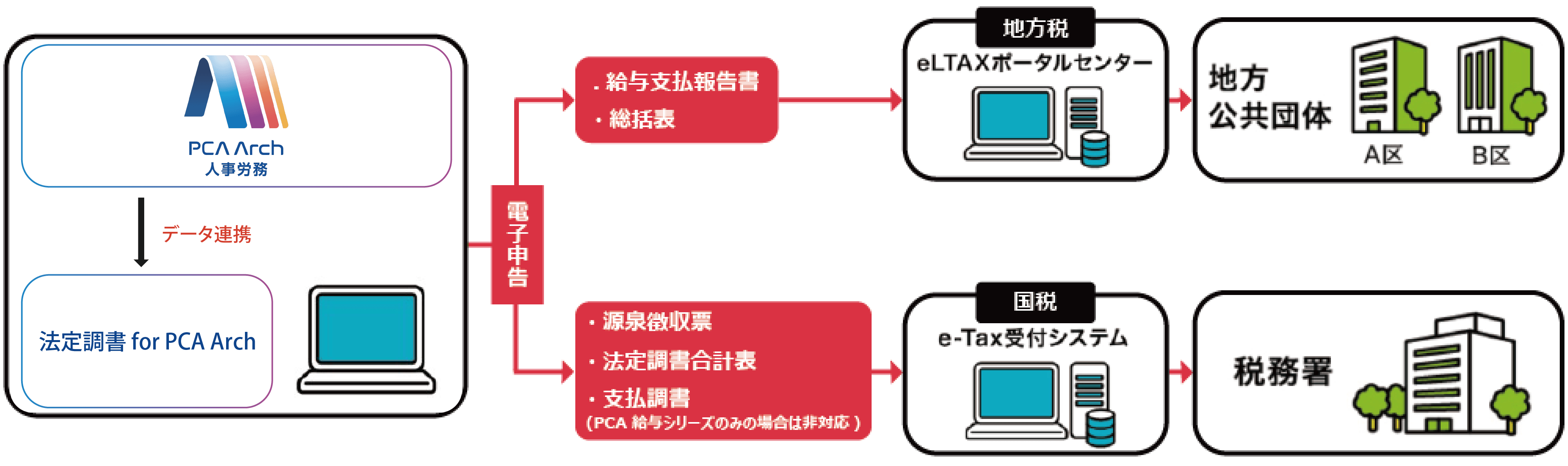 『法定調書 for PCA Arch』では電子申告メニューから直接電子申告をすることが可能です。「e-Taxソフト」や「PCdesk(eLTAX対応ソフト)」を使用せずに直接送信ができます。