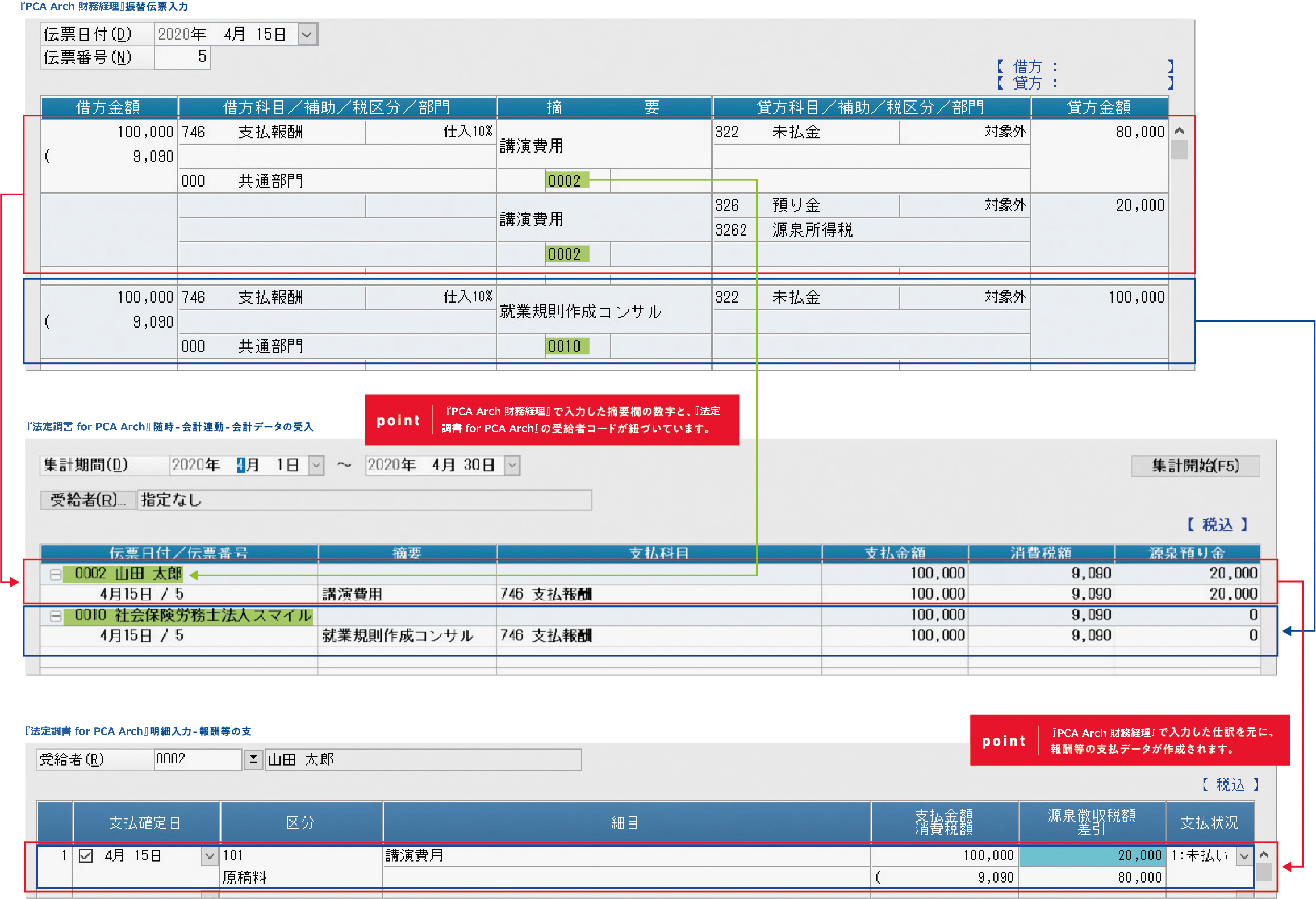 『PCA Arch 財務経理』で作成した「支払報酬」や「源泉預り金」など報酬等の支払調書提出に関連する仕訳データを『法定調書 for PCA Arch』に連動させ、報酬等の支払調書を作成することができます。不動産の使用料等の支払についても同様に『PCA Arch 財務経理』と連動して支払調書の製作が可能です。