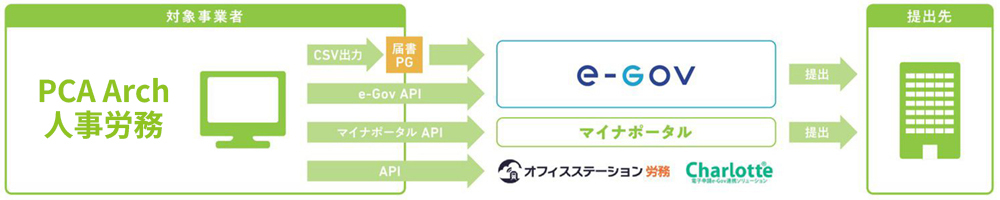 算定基礎届・月額変更届などの社会保険や雇用保険の「CSV添付方式」に加え、「e-Gov API」による電子申請に対応しております。